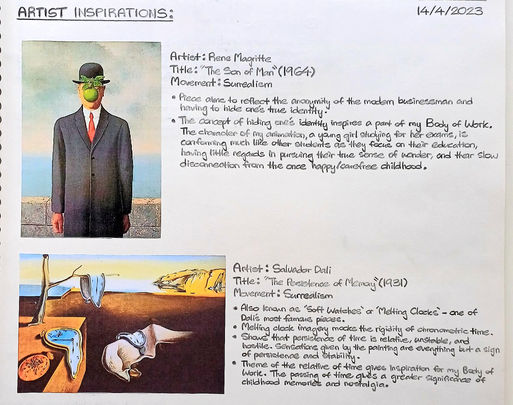 "Reverie of Memories" is a time-based form that aims to illustrate visual, abstract depictions of the early childhood experience. It emits the notion of nostalgia layered over childhood innocence, intended to evoke feelings of poignancy for audience to question if they still view the world as freely and imaginatively as they were once as kids. This concept is strengthened through incorporating my own personal childhood experiences by referencing a popular Australian children's television series, "Giggle and Hoot," a show I've watched frequently when I was little, as might the audience have as well, which may remind them that childhood is a fleeting memory. I enjoy using bright colours to install a child-like yet magical experience. I intend to implement small elements of surrealism into my Body of Work as it assists in constructing the view between the familiarity and discomfort of childhood memories. Regarding surrealism, I am influenced by Salvador Dali's "The Persistence of Memory" (1931), and Rene Magritte's "Personal Values" (1952) and "The Son of Man" (1964).